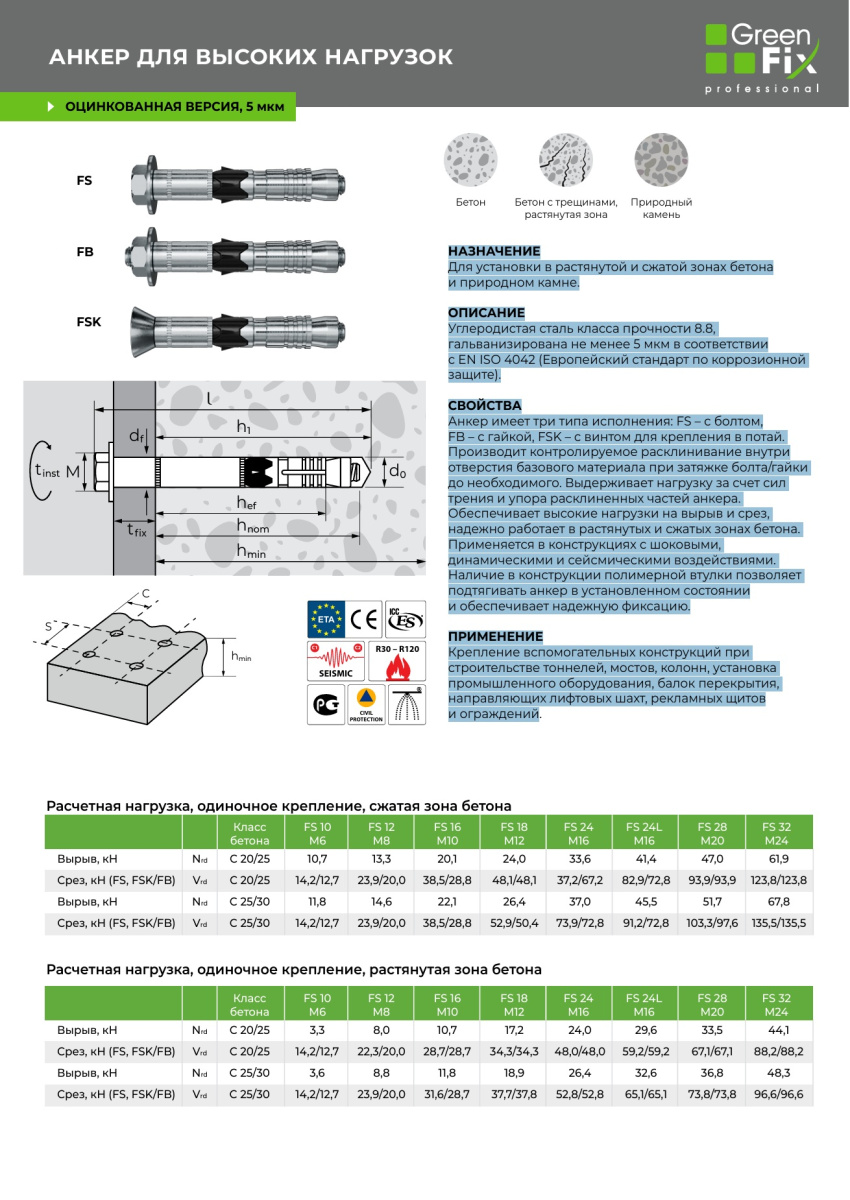 Анкер имеет три типа исполнения: FS – с болтом,
